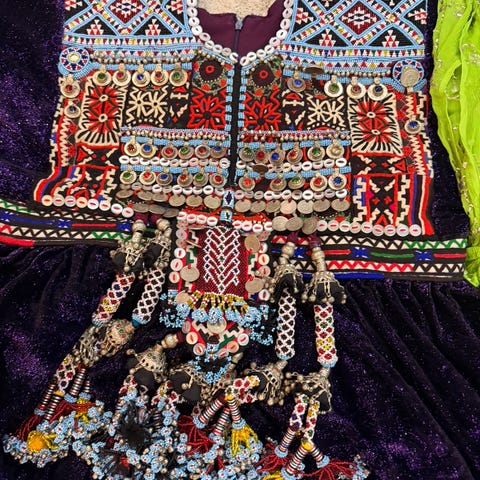 Kjøle er veldig bra velur og har bukse og sjal , Orange sjal og grønn bukse , med mye perler på bryste