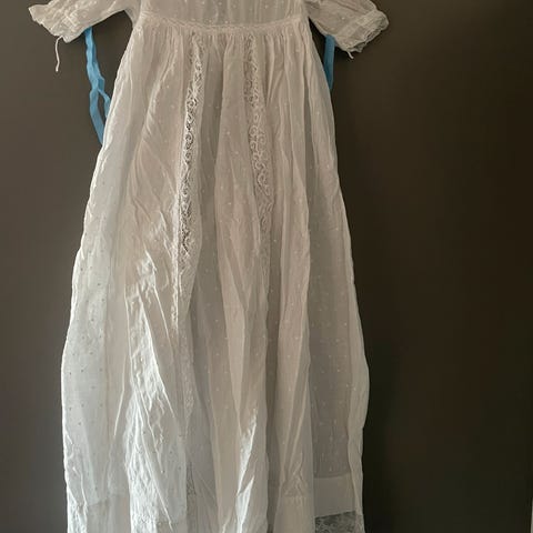 En vintage dåpskjole som var brukt sist i 1952. Det var i skapet i over 70 år. Like fint, bare må renses. Dåpskjole har en te skjorte, en lue og kjolen selv.