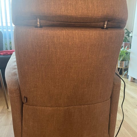 Stofftrekk. Setepute med pocket-fjærer og skumpolstring. Ryggputer i skum. Med innebygd elektrisk trinnløs vippefunksjon og innebygd fotstøtte.