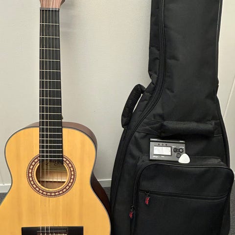 Selger en gitarpakke bestående av en Lag travel gitar, en Fender 12-strenger, og en Gear4Music akustisk forsterker.