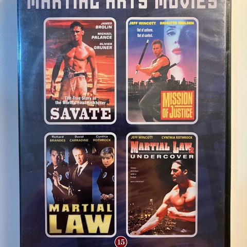 4 Martial Arts filmer fra 90-tallet i en boks med norsk tekst. Inneholder 2 disker. Uåpnet / ny med plast.