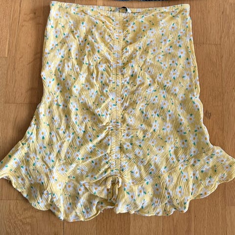 Nydelig, langt skjørt i grønn blomstermønstret viskose, med underskjørt. Elastikk og snøring i livet. En søm har gått opp og må repareres, se bilde.