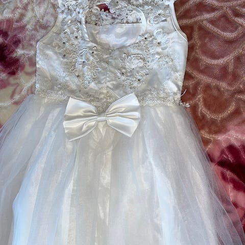 Søt brudepikekjole med fine detaljer selges. Kjolen er i størrelse åtte år, og er veldig pent brukt. Kun brukt noen timer. Selges for 400 kroner.