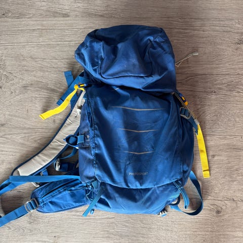 Polstret fotobag i bunnen, åpnes som en 13 liters ryggsekk. Vanntett, skulderem og lommer. Det første bildet viser bagen sammenslått foran og som sekk bakerst.