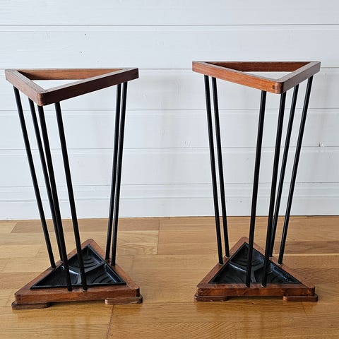 2) 60-talls aviskurv i teak. L39/B20/H43cm. Har fått litt juling med årene så teakfinèren har noen skader samt sidene sitter noe løst. Fullt brukelig, men kan med fordel skifte treverket. Sendes demontert. Selges som repobjekt. SOLGT!!