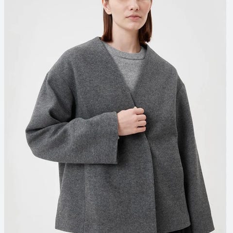 Høy splitt i begge siderne til knytebeltet i samme material. Dermed blir det en fin «åpning» der klærne man har under synes. Bred ribbestrikket kant nede og på ermet.