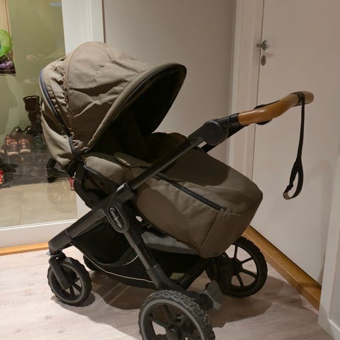 Pent brukt barnevogn med tre stoler som kan montere på hoveddel . Og har flere utstyr og poser.