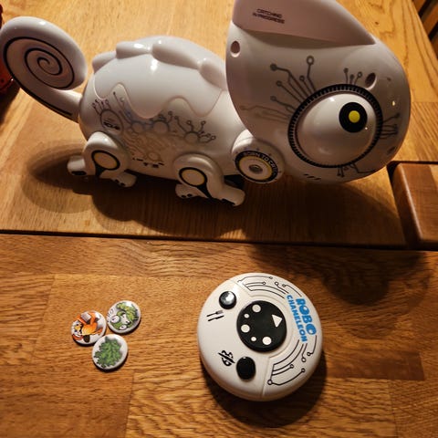 Datteren selger sin robot kameleon. Pent og lite brukt. Følger med fjernkontroll. Kameleonen skifter farge og kan fange "insekter" med tungen, ved hjelp av magnetisme. Dekorert originaleske medfølger. Selges kroner 200,-