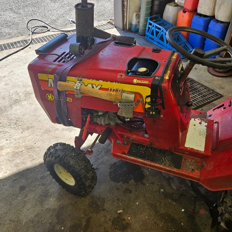 Wheel Horse C 161 med 36 tommers (ca91cm) klippeaggregat med bakutkast selges. Disse klippeaggregatene er kjent for å ikke klippe pent har jeg lest på Internett. Denne modellen ble kun produsert i 1978 og 1979. Den skal egentlig ha en 16 hk motor, men denne har på et tidspunkt blitt skiftet til en 10hk. Jeg kjøpte denne i juli 2023, men jeg har ikke brukt den. Den har bare blitt stående i garasjen. Jeg har skiftet olje på motor og girkasse. Feil og mangler: høy/lav girspaken sitter fast i høy, motor går ujevnt, dårlig gummi i motorfestene, mangler batteri og feste til batteri. Starter og går, men selges som repobjekt.
