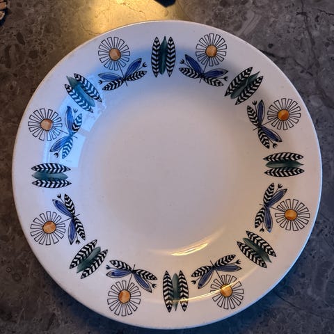 Vintage, dyp tallerken fra Biltons Staffordshire selges rimelig. Nydelig mønster i bunnen. Ingen skader, men bruksmerker forekommer (se bilder). 20 cm i diameter.