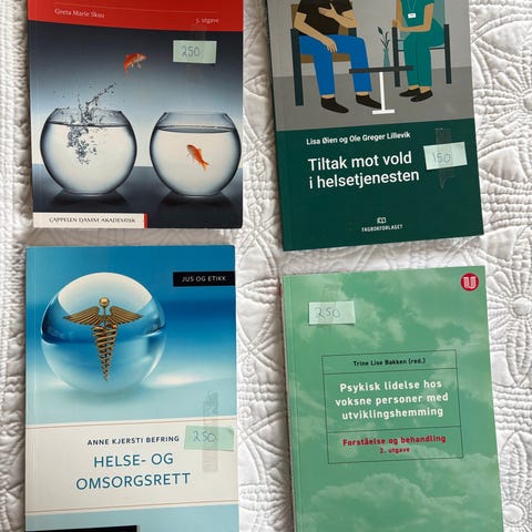 Selger studiebøker for vernepleierutdanning for alle 3 årene til over halv pris! Mange av bøkene er helt nye og ubrukte, noen pent brukte, og et par litt mer brukt (se beskrivelse lengre nede for mer info)