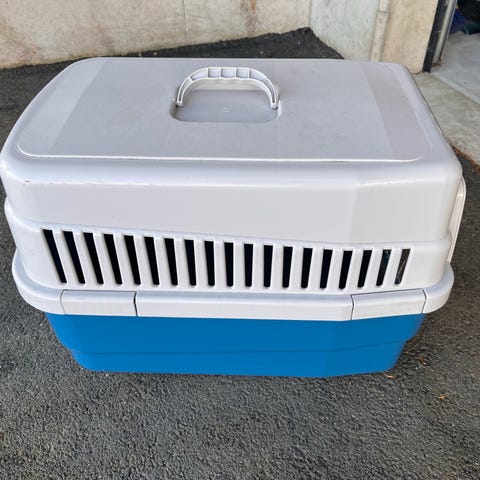 Dette buret ble en gang brukt til å frakte hunden fra utlandet til Norge.