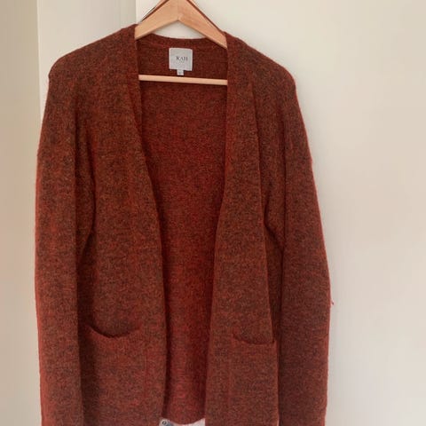 Lang, lys beige strikkejakke av designmerket RAH Oslo, kjøpt hos Åshild som drev motebutikken New Me i Drammen by.