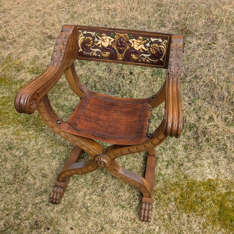 Lekker og detaljert i lær og tre. Den har pene utskjæringer og pene tegninger i læret.