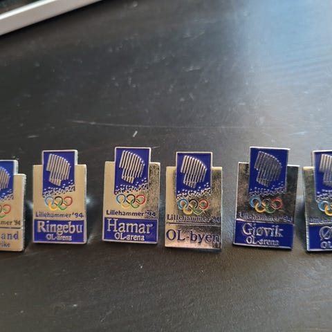 Åtte stk blanke piktogram Pins fra OL 1994 på Lillehammer, selges. De har alle bakstykke for feste. Det er fra øvelsene skiskyting, bandy, aking, langrenn, freestyle, skøyter, bob og hopp. Alle er ubrukt og ligger beskyttet i OL-album med plastlomme.