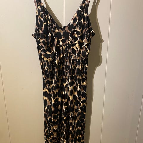 Lang/fotsi svart mønstrete kjole i jersey-stoff (str. 34). Tynne tropper (med justering og vaffelsøm bak i ryggen.