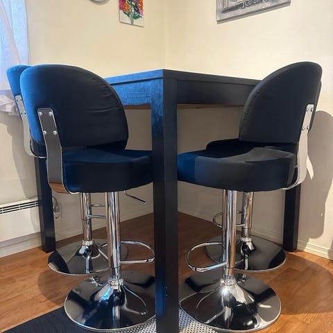 Fantastisk barbordsett med fire stoller ( fra Home og cottage ? )Stolene er håndlaget i eik heltre,konstruert med funksjonelle og fine løsninger,med flettet sete og metalldetaljer.Unik og massiv bordplate med naturlig spill.Alt i veldig bra stand.