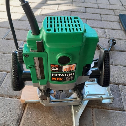 Effektiv og pålitelig håndoverfres fra Hitachi, modell M 8V2. Perfekt for presisjonsarbeid i tre og andre materialer.