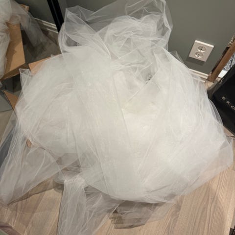 Selger tyll til å pynte i bryllup. Tyllet er kjøpt som gardiner fra Rusta og jeg har totalt 18 lengder. Hver lengde er 2,20m, men et par er klippet opp for å tilpasses bordene vi brukte. Passer fint til både runde og firkantet bord😊 Et par av tyll-dukene har merker av talg etter lysene, men det vises omtrent ikke. Selges helst samlet.