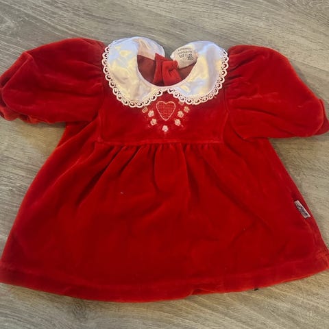The little white company London, rød velur selekjole med tilhørende body, hvor det står «love» på kragen.