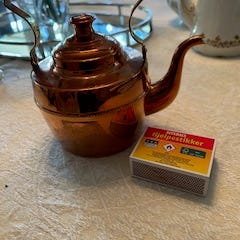 Tekanne i kobber med tre ben og flott hank