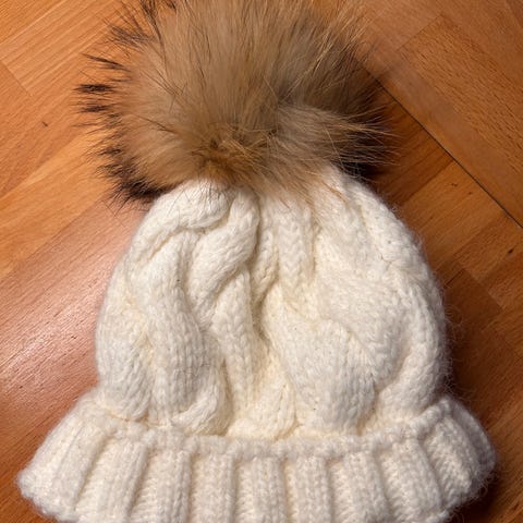 Offwhite lue med dusk. Ribbestrikket. Brukt et par ganger. Kr 50.