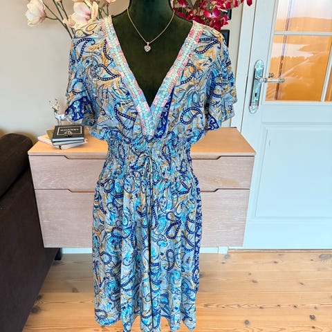 Sommerkjole i mange fine sommerfarger. Ikke brukt. Str: one size. V- åpning i hals og på rygg