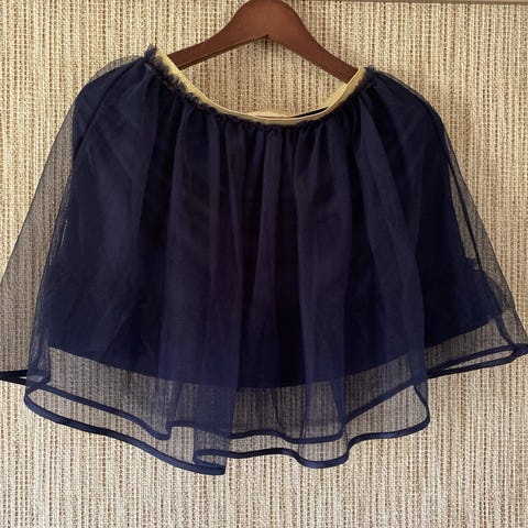 Farge mørk/marine blå, sølvbåndet i livet er strikk.