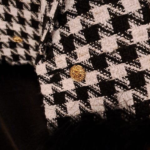 55 % ull og 45 % viscose. Jakken er fôret og den er ikke brukt.