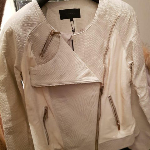 Lys "skinnjakke" med glidelåslukning og glidelås i ermet. Str. 42 og fargen er Antic white. Det er de første bildene som viser riktig farge.