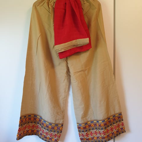 Ikke brukt, kjøpt i Tunisia. Haremsstyle. Lengde fra livet og ned ca. 94 cm. Strikk i livet. Livvidde ca. 32 cmx2, uten at strikken er strukket.