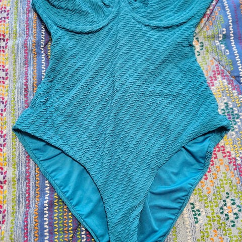 Overdelen er ca medium størrelse og har regulerbare stropper. Skjørtet er litt gjennomsiktig og knytes på siden.