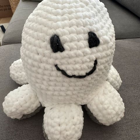 Helt ny, heklet blekksprut bamse. Øyene og munnen er også heklet og sydd godt inn i kroppen på bamsen.