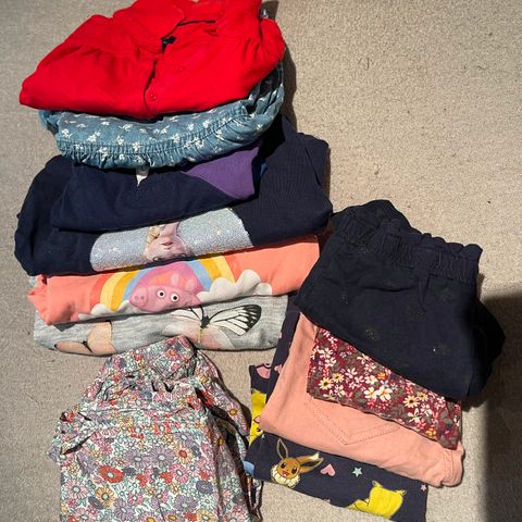 Pene klær til jente selges, se bilder for detaljer. Over 20 sommerplagg. Mange kjoler, shorts, t-skjorter, badedrakt + badesandaler. Mest Name it og HM, men også Reflex, Hummel og andre merker. Ingen hull eller flekker. Røyk- og dyrefritt hjem.