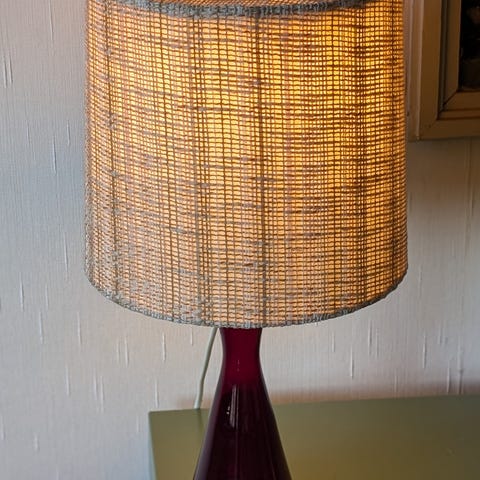 Lampa har original skjerm korn gul som er spesiell og i flott stand. Fot i glas, invändigt försilvrad med krackelerad dekor. Etikettsmärkt.Lampa uten skjermholder er 35 cm med skjerm ca 52 cm