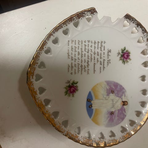 Veggplatte, vintage, med teksten: «Gi oss i dag vårt daglige brød» selges.