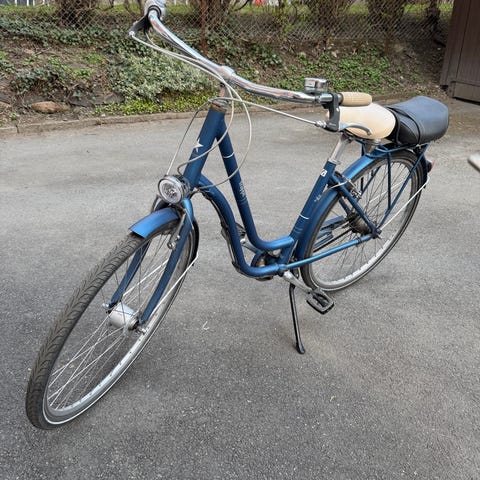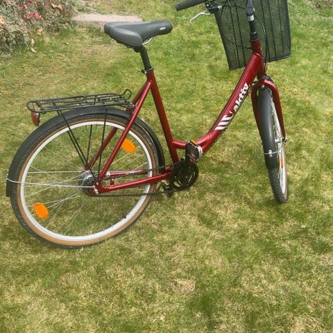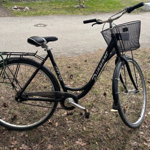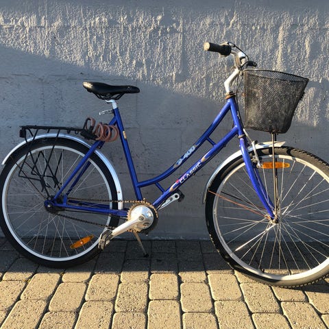 Bra damesykkel i god bruksstand. Sykkelen har 7 gir innvendig i navet bak, som er vesentlig mer vedlikeholdsfritt enn eksterne gir. Gode bremser, V-brems foran og navbrems (tråkk bakover) bak. Den kommer med piggdekk men det kan man selvfølgelig skifte til vanlige dekk. Passer til folk mellom ca 170 til 185 cm.