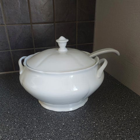 Fin hvit porselen terrin på føtter. Liten bit har falt av kant under lokk men vises ikke når lokket er på. Noe krakeleringa vises utenpå. Made in Portugal.