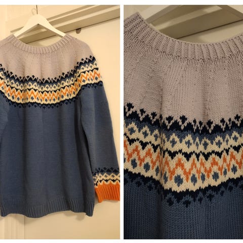 Dette er en nydelig genser. Strikket nedenfra og opp med rund felt bærestykke. I mykt og behagelig garn, og med dekorativt mønster på bærestykket kan denne fort bli en favoritt.