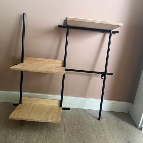 Vegghylle i metall som er i varm beige/terakotta-farge og petroleumsfarget «innerhylle».
