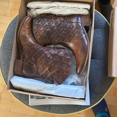 Kule slippers i sort skinn med hvit såle. Litt platå. Str 40. Brukt kun en gang og er i god stand. Sparing i front og kul åpning i begge sider av skoen. Skinn foret