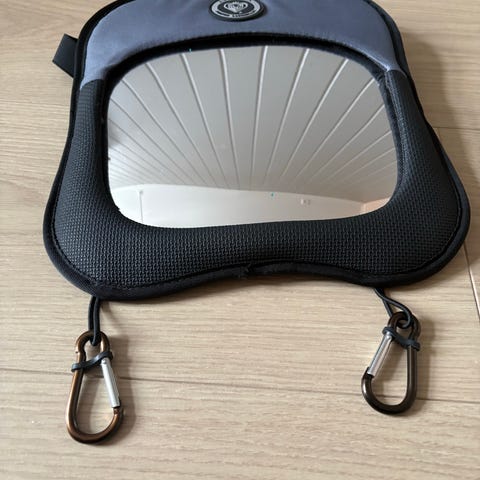 Kan ikke knuses. Riper i plastikk/speil, men helt tydelig og klart speilbildet av barnet som sitter i baksetet. Se siste bildet.