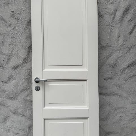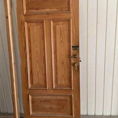 Dette er en tung, solid dør fra 1930 tallet. Mål er: Høyde 185cm, og bredde 82cm.