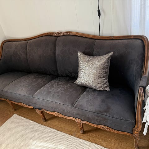 Største lengde 122 cm, bredde ca 62 cm, høyde på sete 45cm, høyde rygg 95 cm