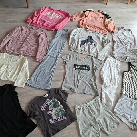 5 topper med lang armer, 6 bukser/leggings, stryke genser og hettejakke. Kommer fra røyk og dyr fri hus.