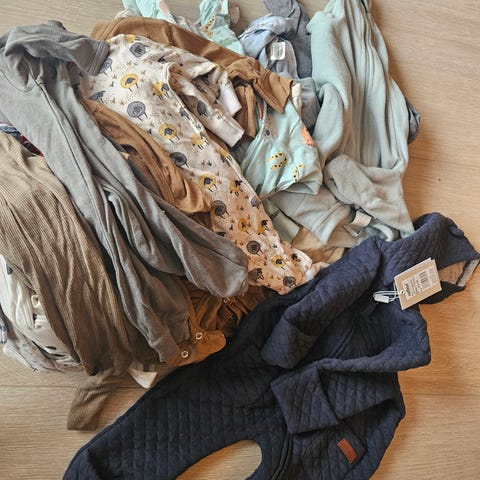 Bukser, genser, jakke, heldress, sparkedresser, luer og mange omslagsbodyer og vanlige bodyer (kortermet og vanlig).
