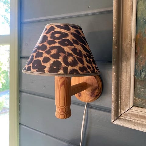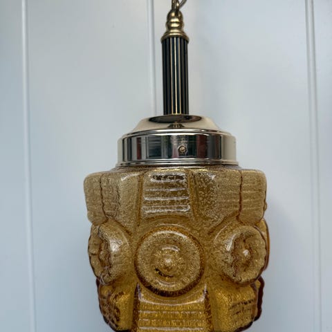 Unik lampe med kuppel i farget glass med dekor og sokkel i porselen. Fra 40- eller 50-tallet, men absolutt fullt brukbar også i dag. Kan selvsagt brukes med led-pære og dimmer om ønskelig.