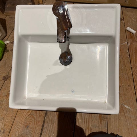 Servant/bolle til "design"-vask for montering på hyller eller underskap. Glass blågrønn. Dia 40cm- høyde 17 cm. Rørdeler må kjøpes hos rørlegger. Kan også bli til en original pendellampe. Kr. 400 eller bud. Må hentes i Kongsvinger.