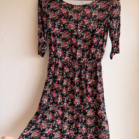 Blomstrete kjole med blonderygg. Glidelås bak. Passer str S og liten str M.