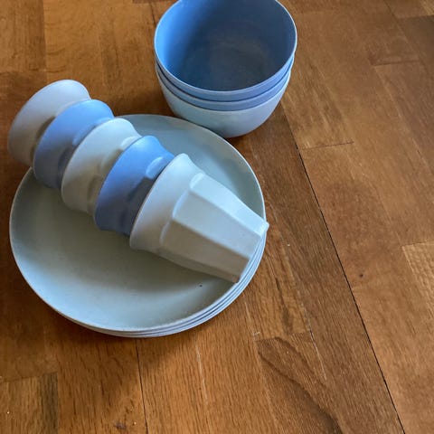 Servelett til oppbevaring av smør, ost, pålegg. Både beholderen og lokket kan brukes begge veier. Eggeglassene med lokk for å holde eggene varme. Lokkene kan også brukes som små glass.